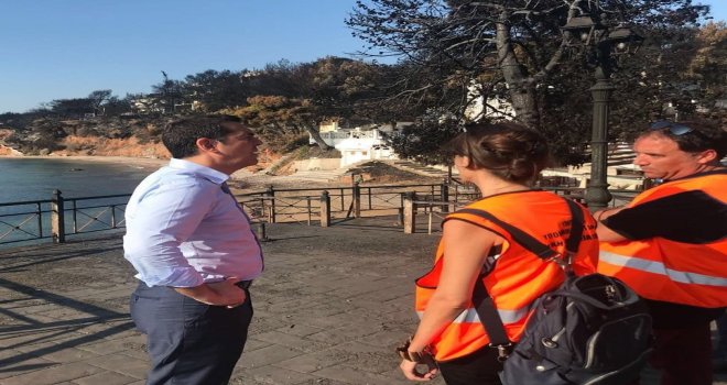 Yangın geçen Pazartesi günü ormanlarda başlamıştı ve 2 bin 500 evin de yanmasına sebep olmuştu. Yunanistan Başbakanı bir hafta boyunda bölgeye gitmemişti. Çipras, bu sabah saat 07.00de felaket bölgesine gitti ve devlet televizyonu dışında hiçbir medya kuruluşuna haber verilmedi. Çipras, ziyareti esnasında itfaiyecilerle ve askerlerle konuştu. Ayrıca hasar görmüş binaların kayıtlarını tamamlamak için bölgede kalan mühendis ve gönüllülerden de bilgi aldı.