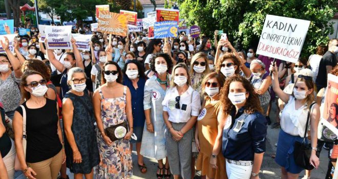 Türkiye’nin pek çok ilinde olduğu gibi bugün İzmirli kadınlar da kadınları her türlü şiddete karşı korumaya yönelik olan İstanbul Sözleşmesi’nin iptal edileceğine ilişkin tartışmalara tepkilerini dile getirmek için sokaklara indi. Alsancak ÖSYM önünde bir araya gelen kadın örgütleri, sendikalar ve sivil toplum kuruluşları temsilcileri ile çok sayıda kadın “İstanbul Sözleşmesi yaşatır, vazgeçmiyoruz” sloganı ve alkışlar eşliğinde seslerini duyurmak için basın açıklaması yaptı. Sadece temmuz ayında 36 kadının öldüğünü vurgulayan kadınlar, “Biz kadınlar haklarımızın yerine getirilmesi için yun yana durmaya, hep birlikte mücadele etmeye devam edeceğiz. Kadınların mücadelesi engellenemez. İstanbul Sözleşmesi ile ilgili tartışmalara derhal son verilsin. Biz kadınlar yaşamak istiyoruz” dedi.
