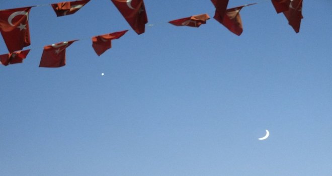 Tören boyunca gökte ay ve yıldızın birlikte verdikleri görüntü ise vatandaşlar tarafından cep telefonları ve fotoğraf makineleri ile görüntülendi.