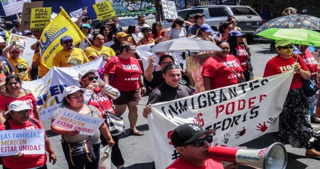 ABD Başkanı Donald Trumpın göçmenlere karşı sıfır tolerans politikası tepki toplamaya devam ediyor. Los Angelesın merkezindeki McArthur Parkta toplanan 16 sivil toplum kuruluşunun çağrısıyla, Göçmenlik ve Gümrük Muhafaza (ICE) uygulamaları protesto edildi. “Aileler Bir Arada Olmalı” protestosuna büyük sivil toplum kuruluşları da katıldı. Protestocuların geçeceği yolları araç trafiğine kapatan polis, göstericilere yol boyunca eşlik etti.